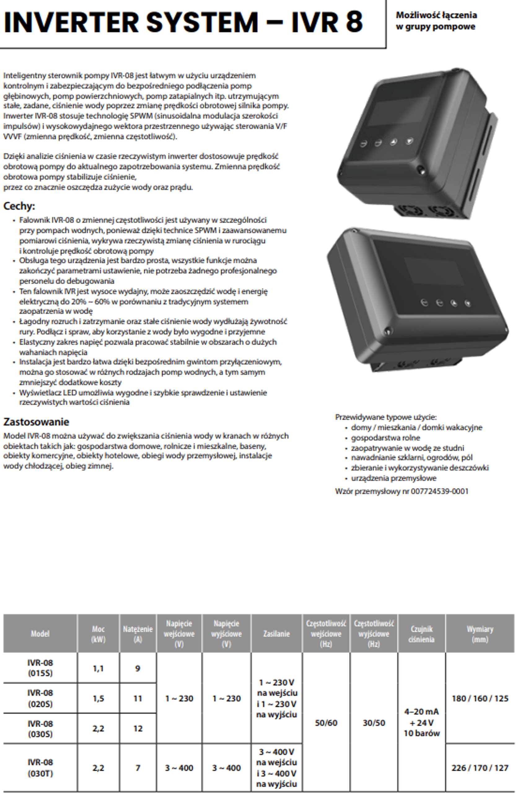 IVR-08 to seria inteligentnych sterowników, umożliwiających energooszczędne i komfortowe zarządzanie pracą pomp w instalacjach domowych i nawadniających. Programujesz żądane ciśnienie i zawsze masz je w instalacji na tym samym poziomie, niezależnie od pobieranej chwilowo wydajności!