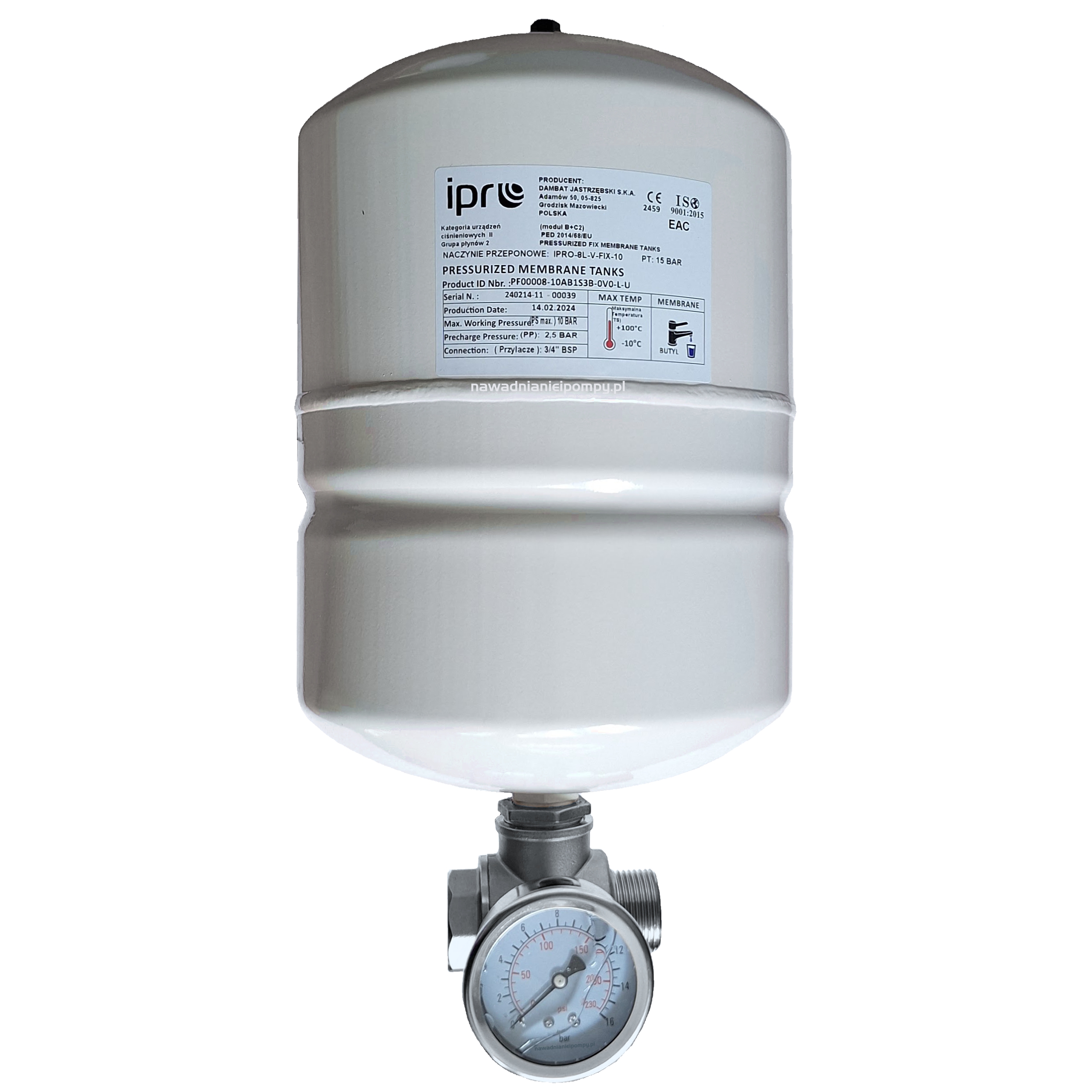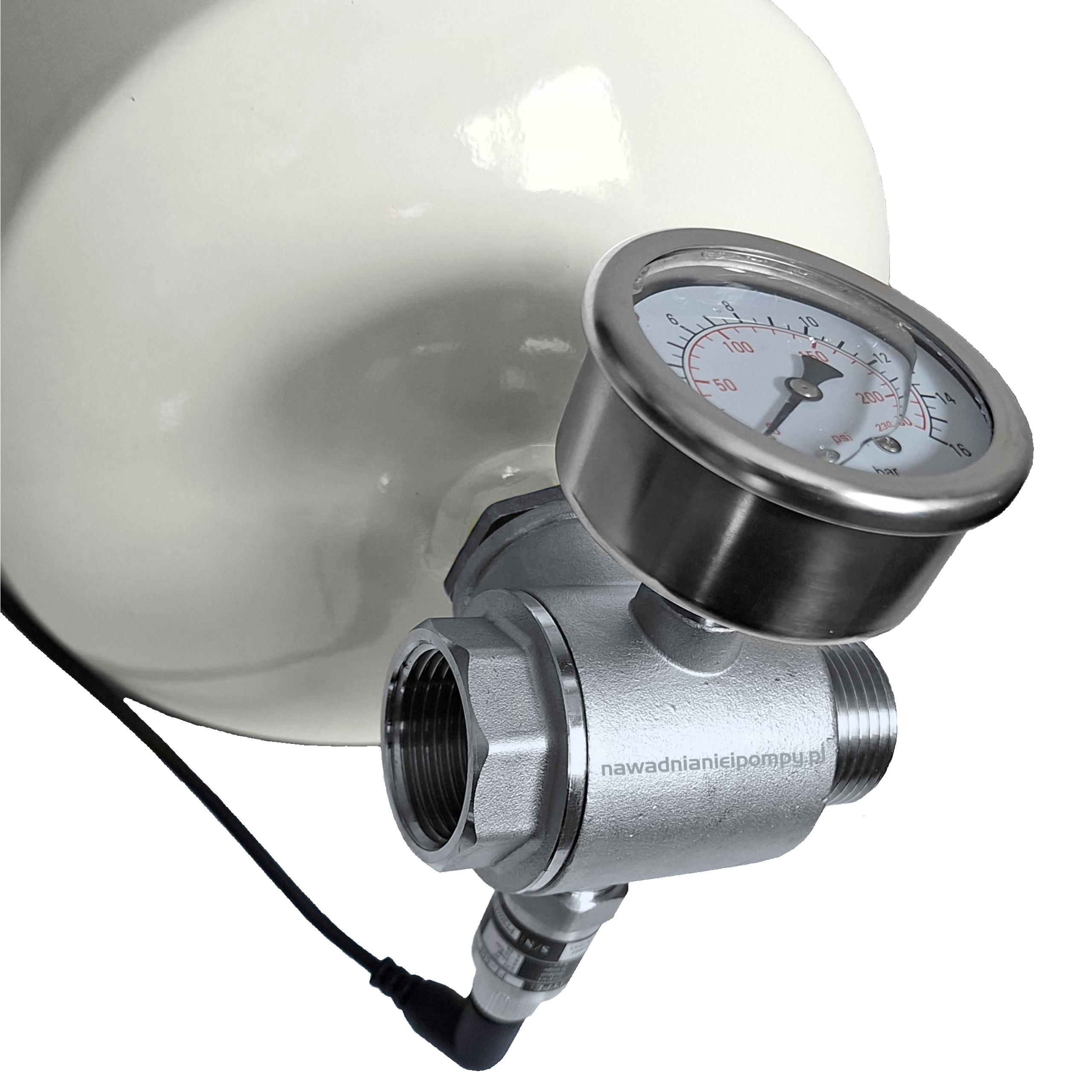 Zbiornik jest skompletowany z w pełni mosiężną armaturą, umożliwiającą montaż rur oraz czujnika ciśnienia. W zestawie znajduje się zawór zwrotny z mosiężnym trzpieniem i grzybem oraz śrubunek oringowy, zapewniający bezproblemowe podłączenie zbiornika.