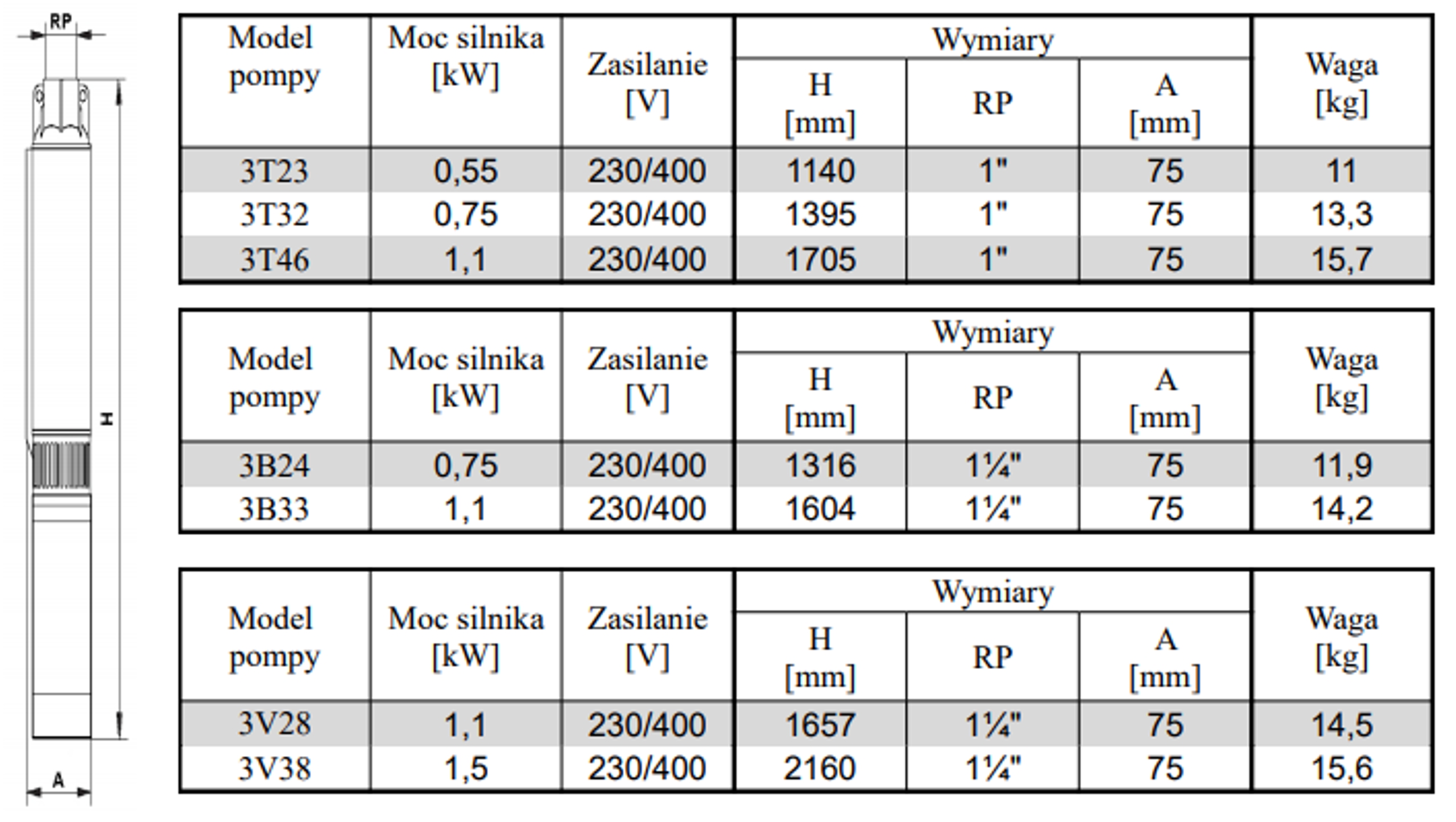 3B to sprawdzona, wielostopniowa konstrukcja przeznaczona do czerpania czystej, zimnej wody ze studni wierconych o średnicy płaszcza 90 lub 110mm.