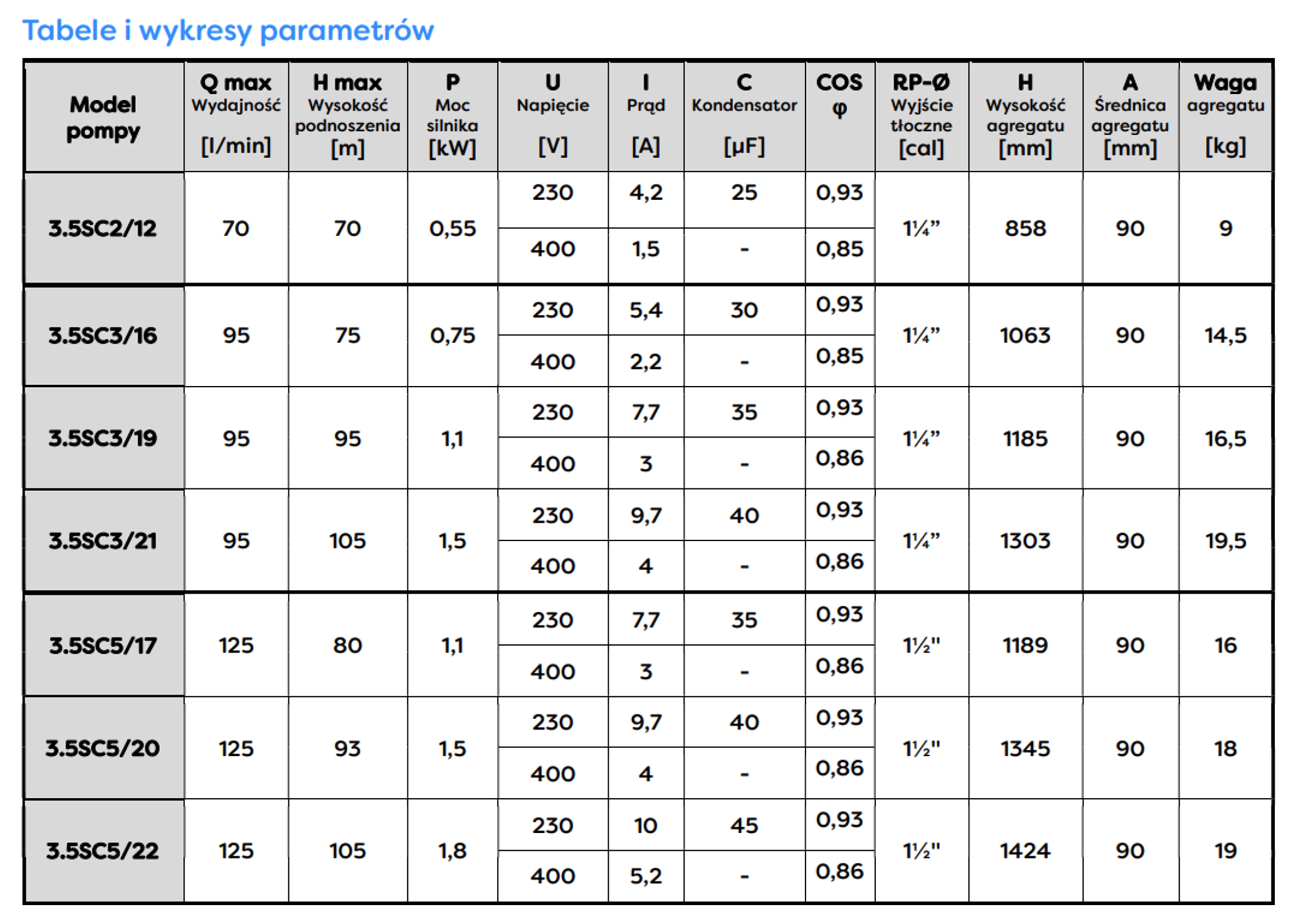 3,5SC to sprawdzona, wielostopniowa konstrukcja przeznaczona do czerpania czystej, zimnej wody ze studni wierconych o średnicy płaszcza 110 lub 125mm.