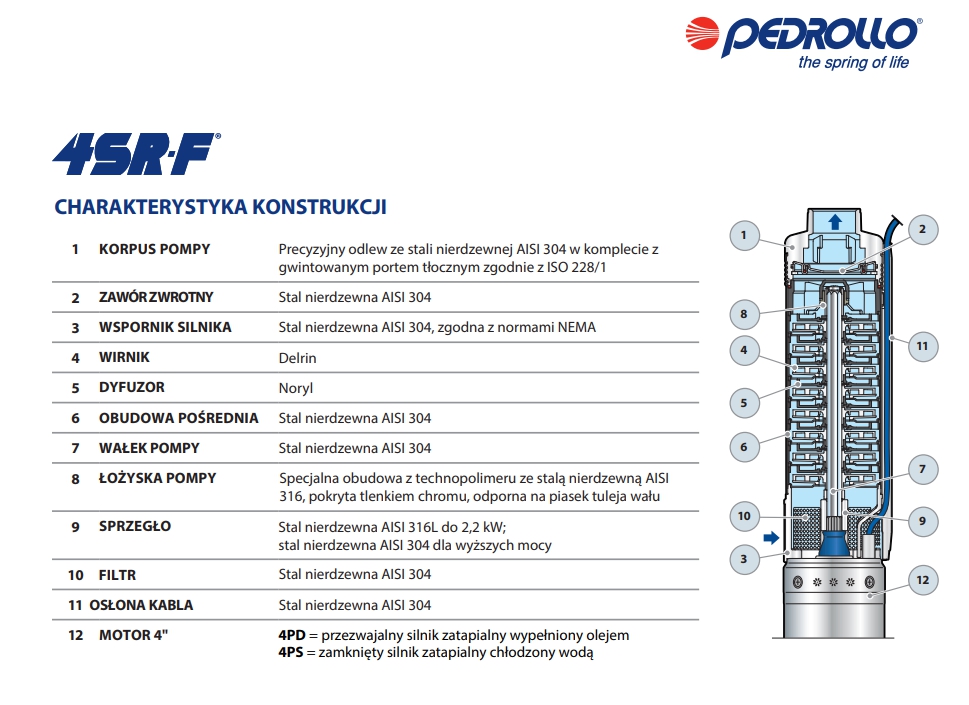 4SR-F to wielostopniowa pompa głębinowa o opatentowanej konstrukcji wirników pływających, umożliwiających tłoczenie wody o zawartości piasku do 200g/m3.