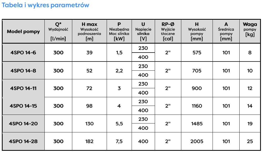 SPO to sprawdzona, wielostopniowa konstrukcja przeznaczona do czerpania czystej, zimnej wody ze studni wierconych o średnicy płaszcza 125mm lub większej.  Hydraulika pompy wykonana jest w całości ze stali nierdzewnej i współpracuje z włoskim silnikiem olejowym, co gwarantuje długotrwałą i bezawaryjną pracę.