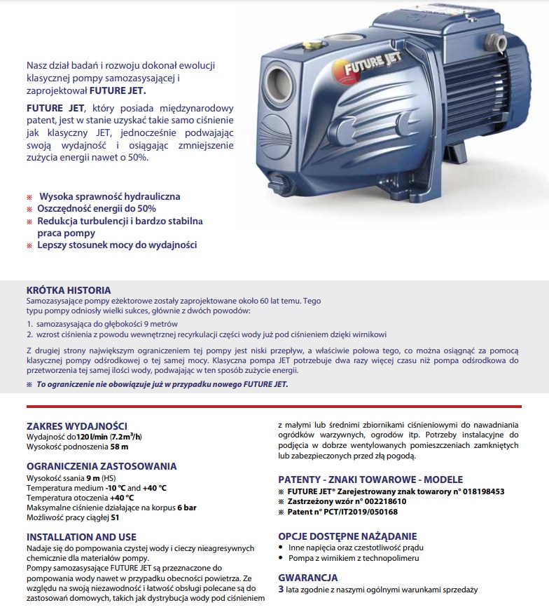 FUTURE JET to opatentowana pompa, która zużywa nawet o 50% mniej energii, niż podobne konstrukcje o identycznych parametrach!