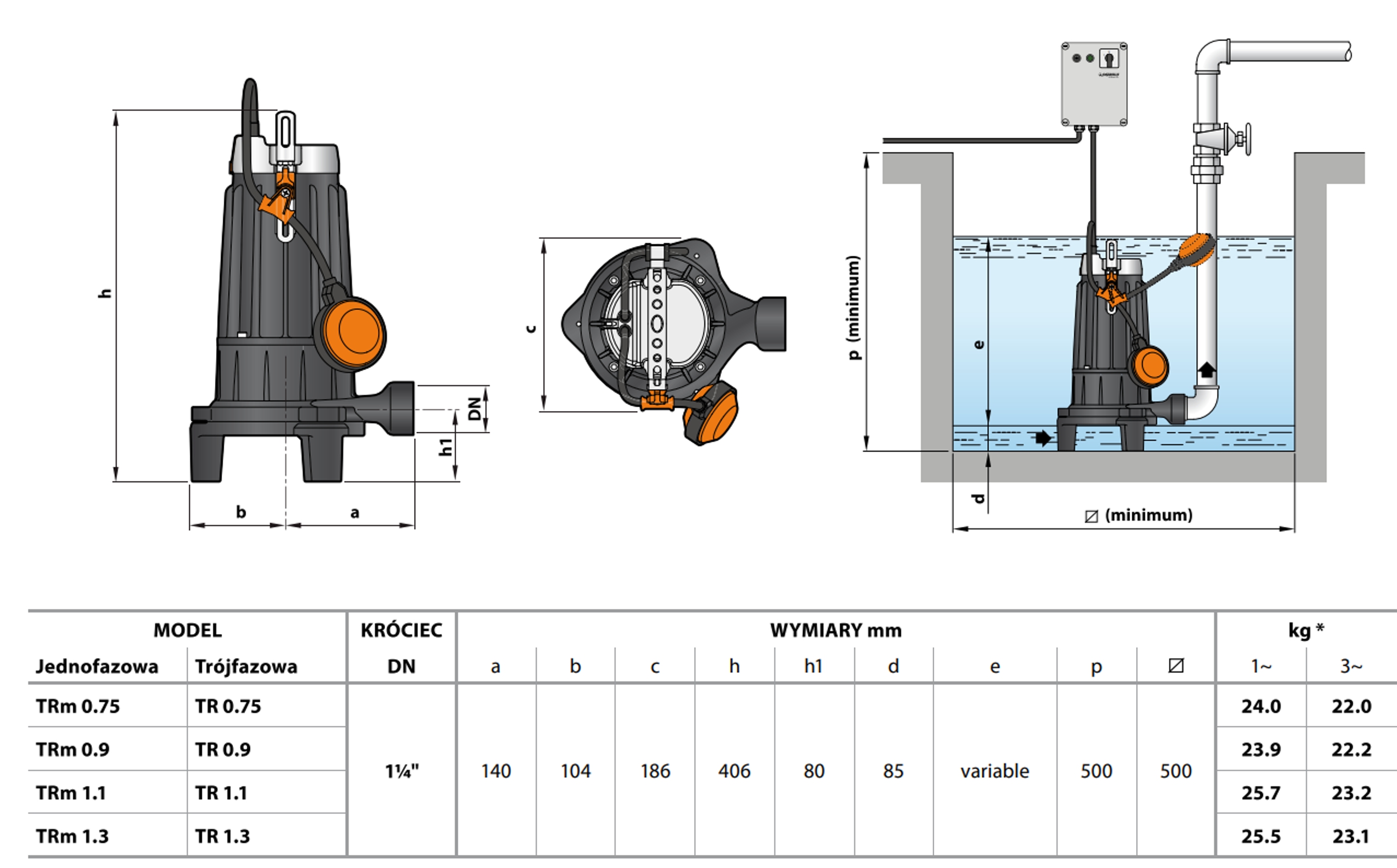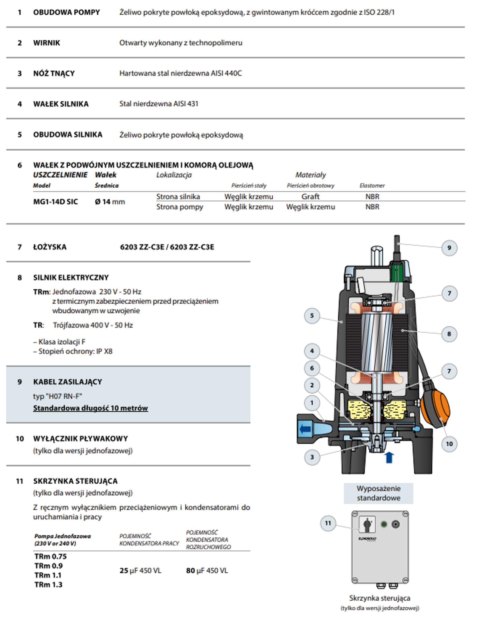 - wyłącznik pływakowy: tak (tylko dla 230V)