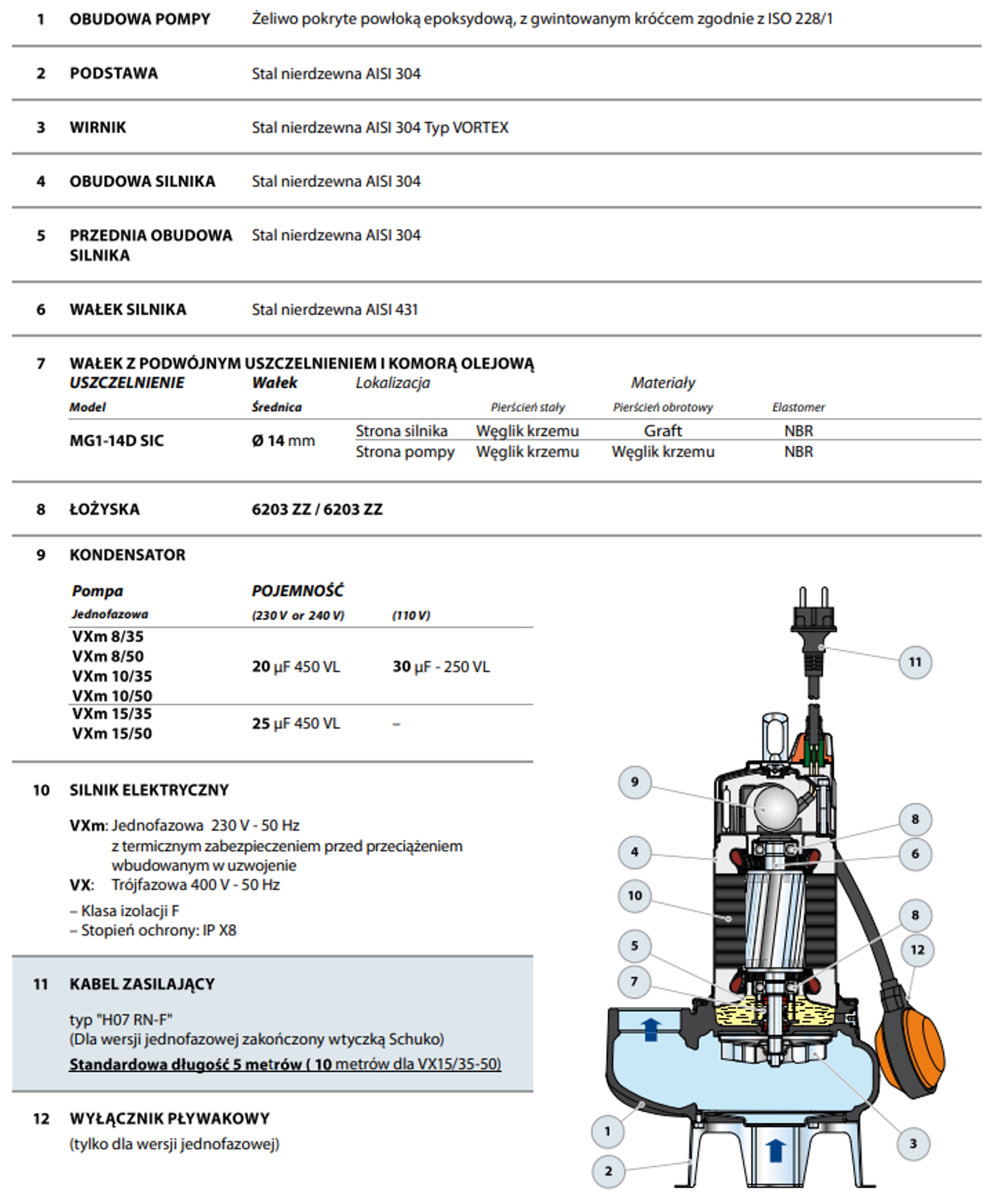 - wyłącznik pływakowy: tak (tylko dla 230V)