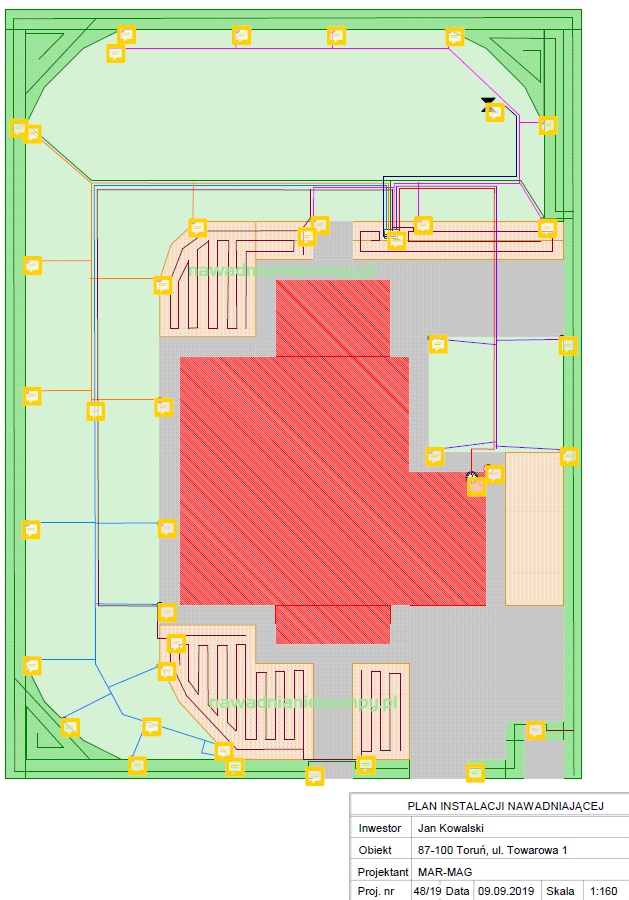 - rozmieszczenie zraszaczy i linii kroplujących oraz ich nazwy/symbole