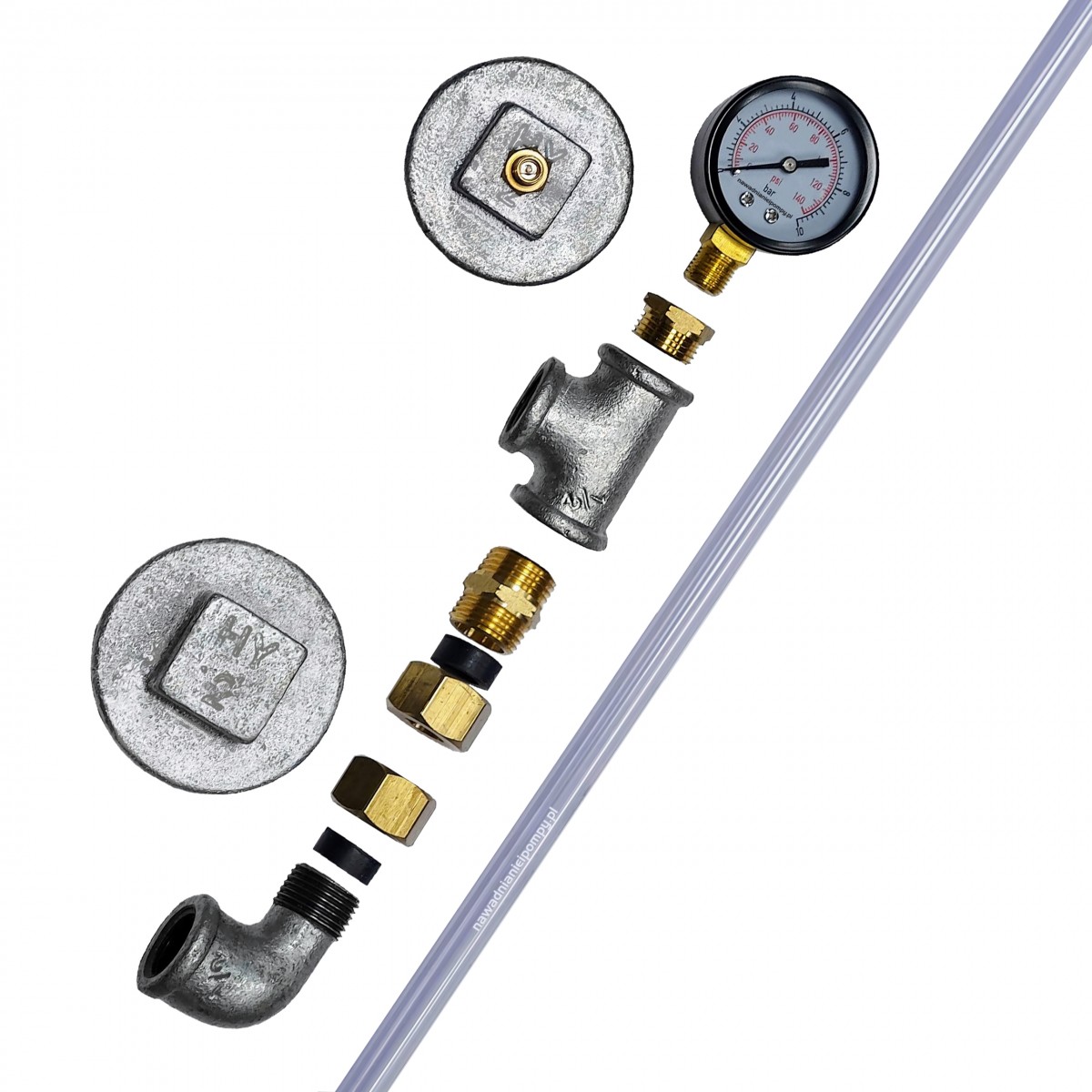 - w zestawie: korek ocynkowany, korek ocynkowany z "wentylem", manometr, trójnik ocynkowany, kolano ocynkowane, nypel ocynkowany, redukcja mosiężna, nakrętki mosiężne uszczelki i rurka płynowskazowa