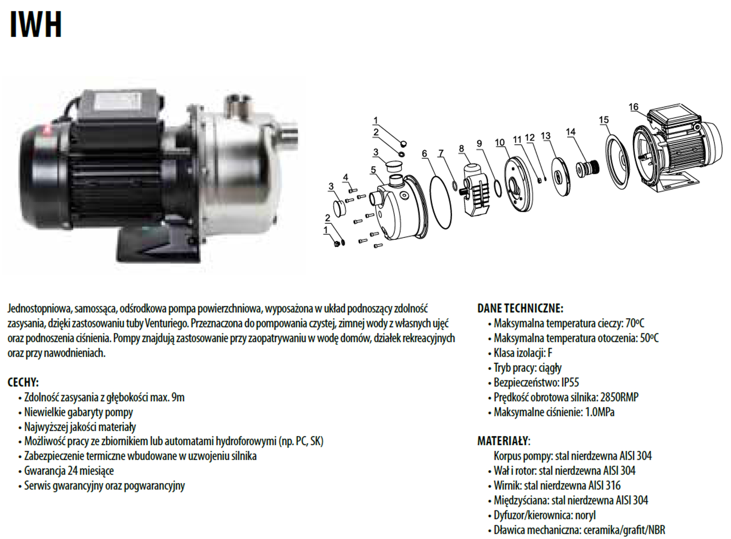 Silniki pomp IWH posiadają izolację uzwojeń klasy F oraz tryb pracy S1 - do pracy ciągłej!