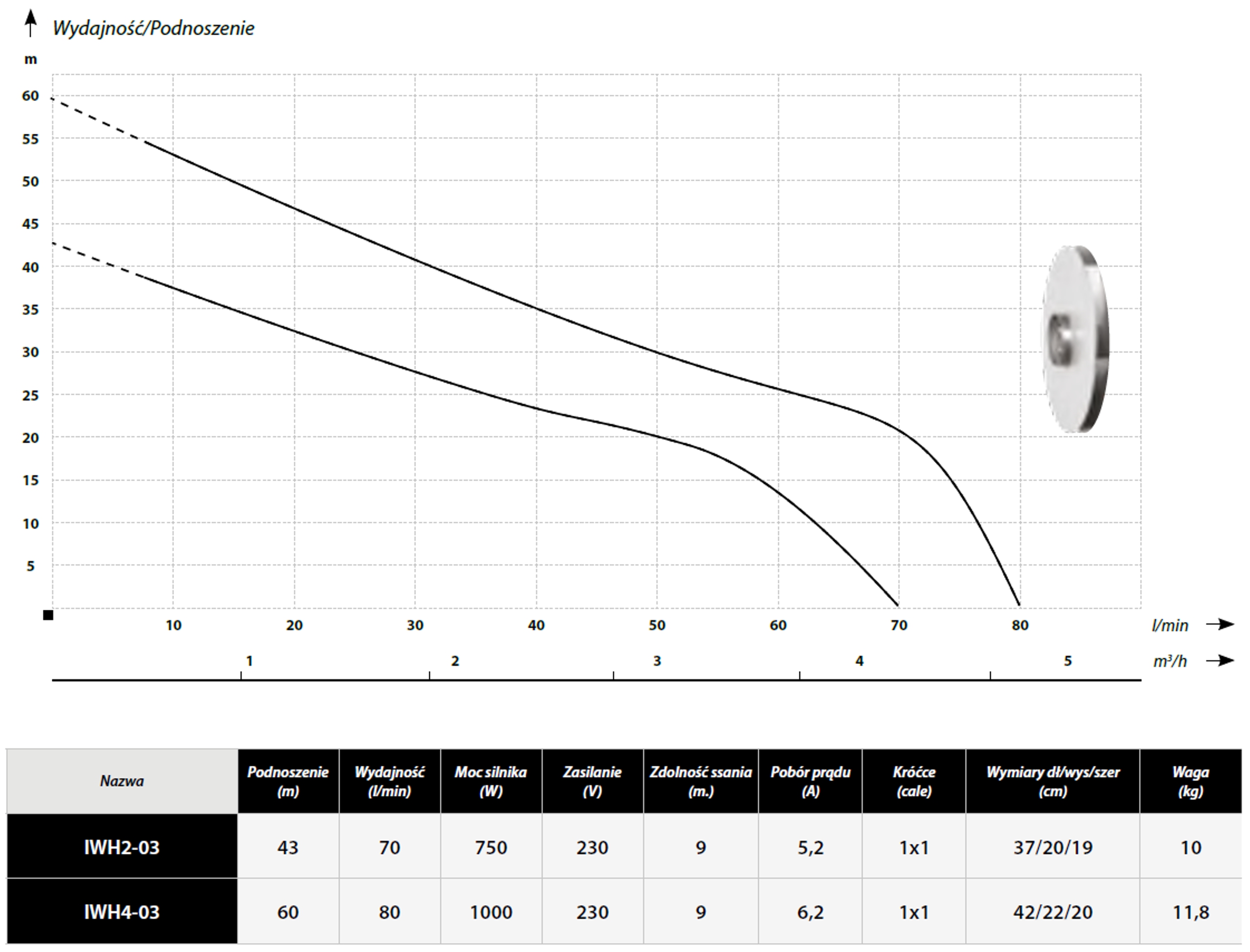 Określamy wydajność, wysokość podnoszenia oraz wysokość ssania np. "do 100L/min", "do 5,5bar". Dlaczego? Na tabliczce znamionowej urządzenia znajdują się parametry maksymalne, krańcowe. Przykładowa pompa osiąga 100l/min (przy ciśnieniu 0,0bar) lub 5,5bar (przy wydajności 0,0l/min). Zależność parametrów pomiędzy ich wartościami maksymalnymi należy odczytać z wykresu, stosując uproszczony przelicznik 10m wysokości podnszenia = 1,0bar.